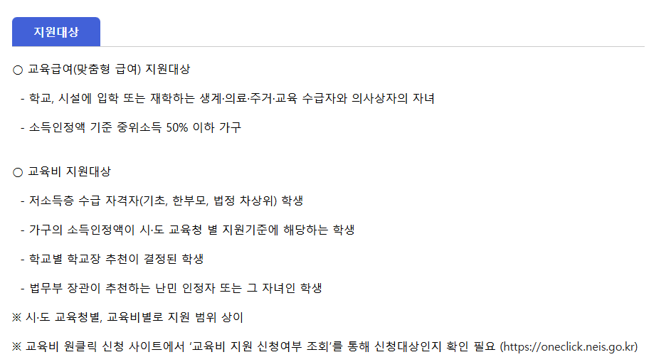 교육비: 기초생활수급자, 한부모가족보호대상자, 법정 차상위 대상자 등